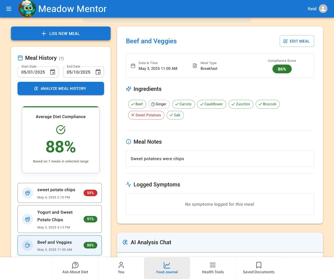 AI-Powered Meal History Analysis: Our AI doesn't just store your data; it learns from it. Based on your past journal entries, Meadow Mentor provides actionable advice and insights, helping you identify personal trigger foods or patterns you might have missed.